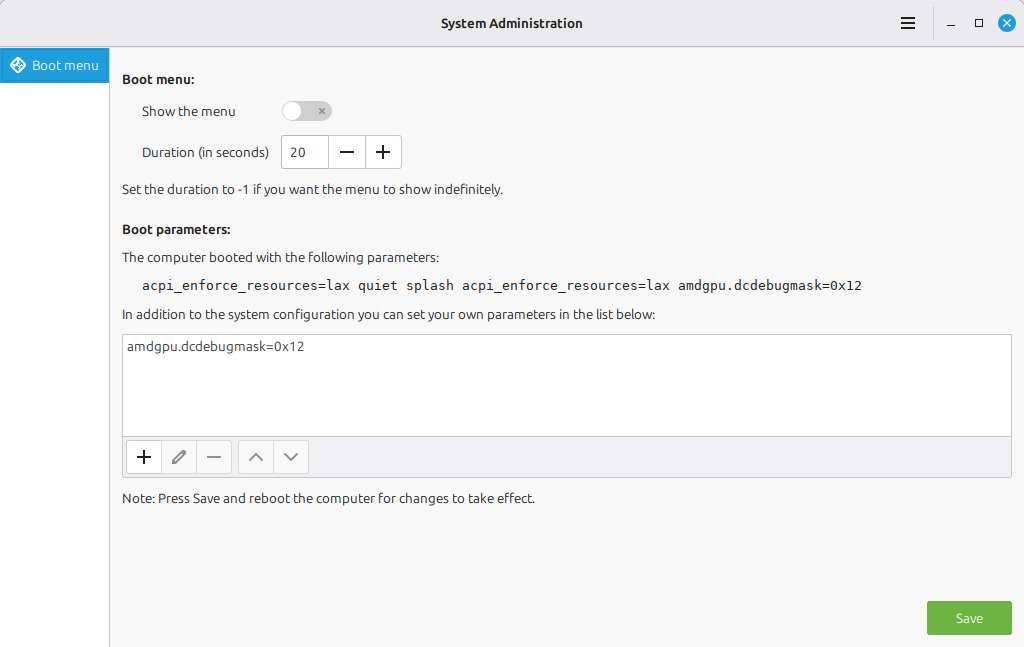 At the top you can show or hide the boot menu and set how long it stays visible before booting the default option. This is very useful if you're dual-booting or if you're using multiple kernel series.